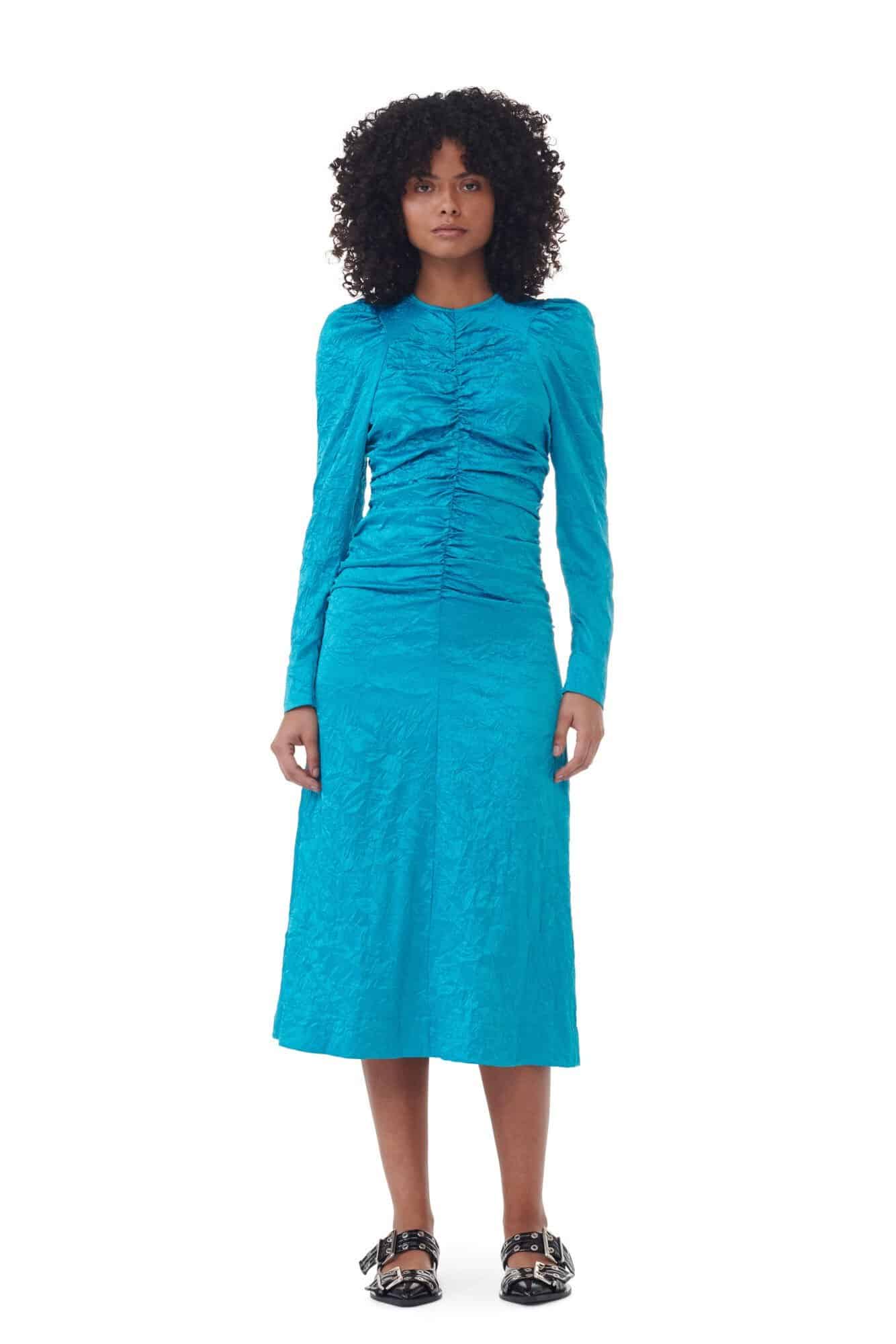 Opdag den unikke stil med Crinkled Satin O-Neck Midi Dress fra Ganni, der kombinerer moderne design med tidløs elegance. Denne kjole er perfekt til både festlige anledninger og hverdagsbrug, hvor du ønsker at skille dig ud med et sofistikeret look.- Unik