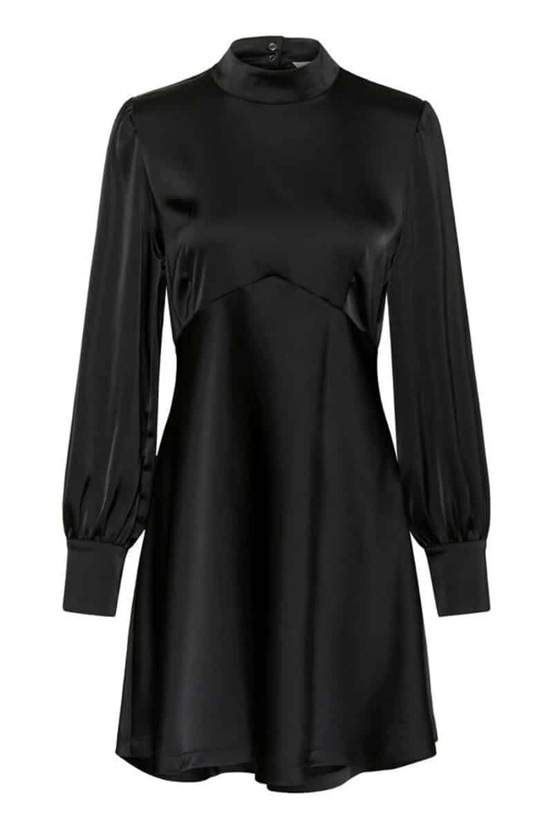 En smuk kjole i denne satin kvalitet fra Gestuz er kommet i en klassiske sort farve som man aldrig går galt i byen med. Den er med A snit og derfor passer den også de fleste kropstyper.Â