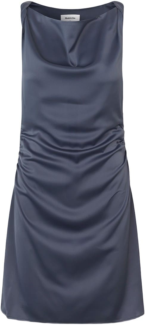 Kort kjole i mørkeblå med vandfalds detalje fortil. MylaMD dress er lavet i satin og har en usynlig lynlås i siden