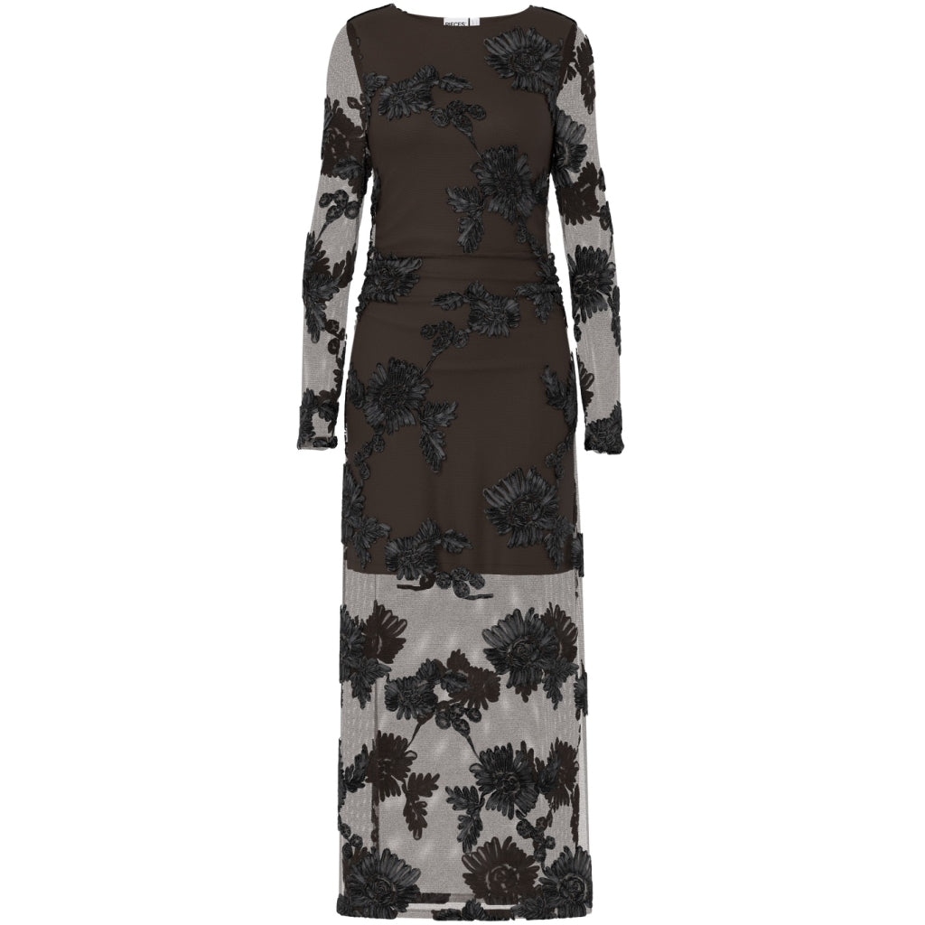 En ankellang kjole med rund hals og tætsiddende pasform. Kjolen har lange, smalle ærmer og meshdetaljer, der giver et stilfuldt udtryk.- Ankel-lang med rund hals – Tætsiddende og figursyet – Lange, smalle ærmer – Meshdetaljer til et moderne look – Velegne