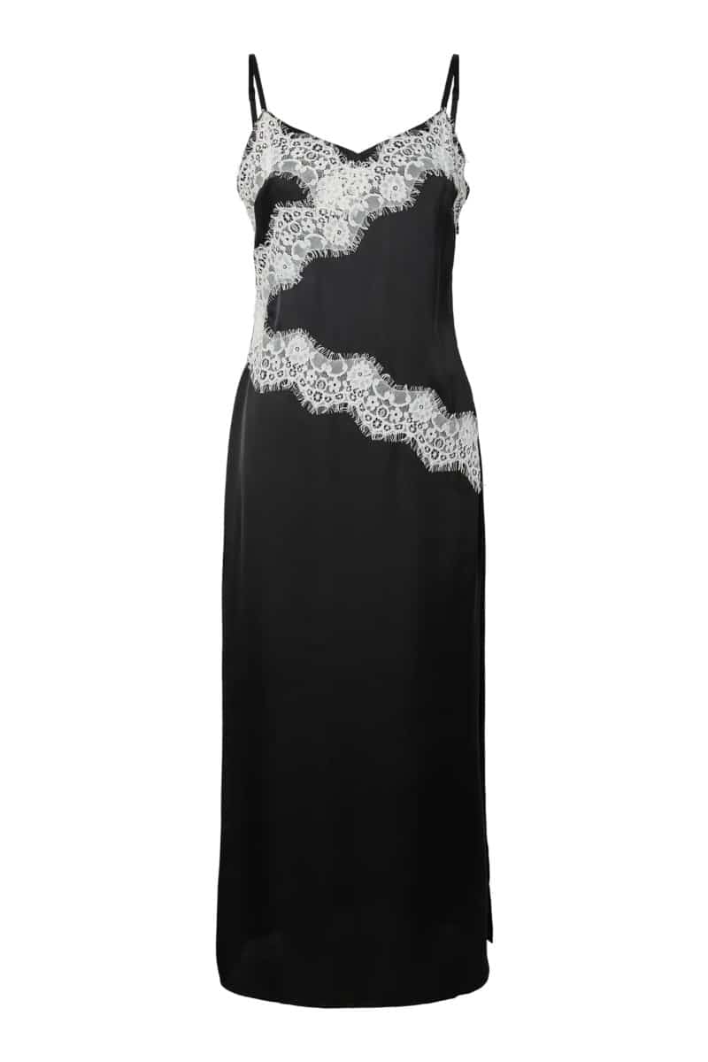 En fin kjole i sort satin look fra Pieces er kommet med fine blondedetaljer ved brystet og ved taljen. Den har tynde spaghetti stropper so er justerbarer. Derudover er den også fin sammen med den matchende underdel.Â