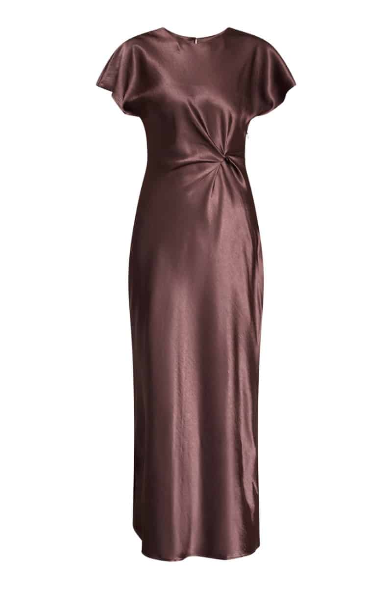 En smuk kjole i satin look fra Sisters Point. Denner i en den smukkeste brune farve som er perfekt til denne sæson. Den kommer også i en støvet rosa farve. Den er fine til en stilet og med den små ærmer og den lille knude detalje ved taljen er den simpelt