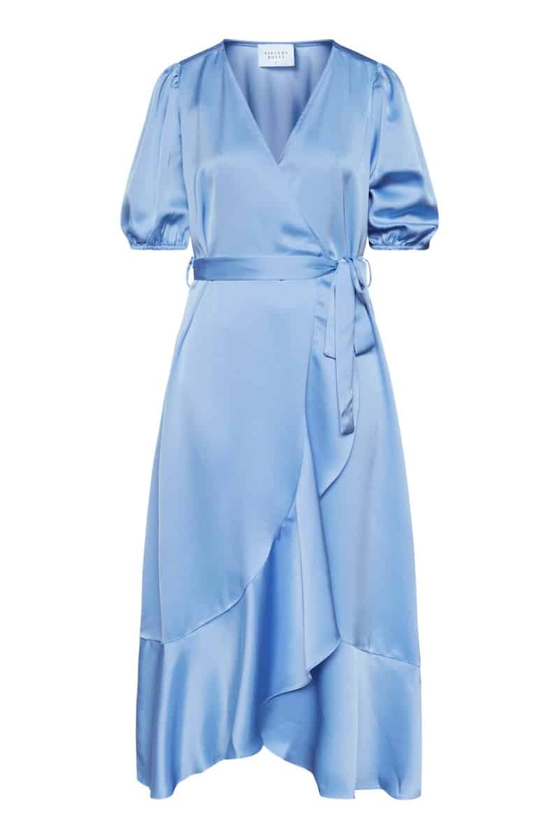 En sød kjole i en slå-om model fra Sisters Point er kommet i en lækker satin kvalitet. Den giver den smukke figur og har en peplum effekt i bunden samt løse ærmer. Den findes i flere farver.Â